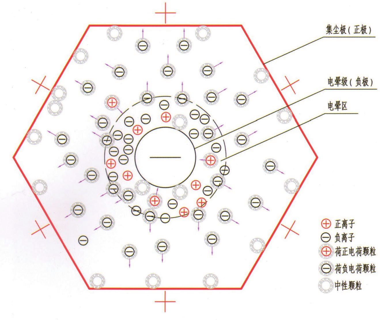 濕式電除塵(霧)器與幹式電除塵器的收塵原理相同,運行中都有三個階段—荷電、集塵和清灰;高壓電暈放電使得粉塵荷電,荷電後的粉塵在電場力的作用下到達集塵闆/管後,采用合适的方式清理集塵闆/管上的集灰。